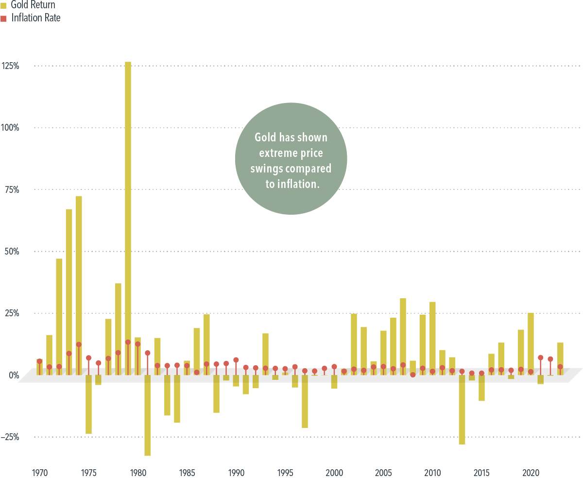 While gold prices have sometimes risen during inflationary periods, the relationship has been inconsistent. Gold prices tend to move in larger swings that do not closely match gradual changes in consumer prices.