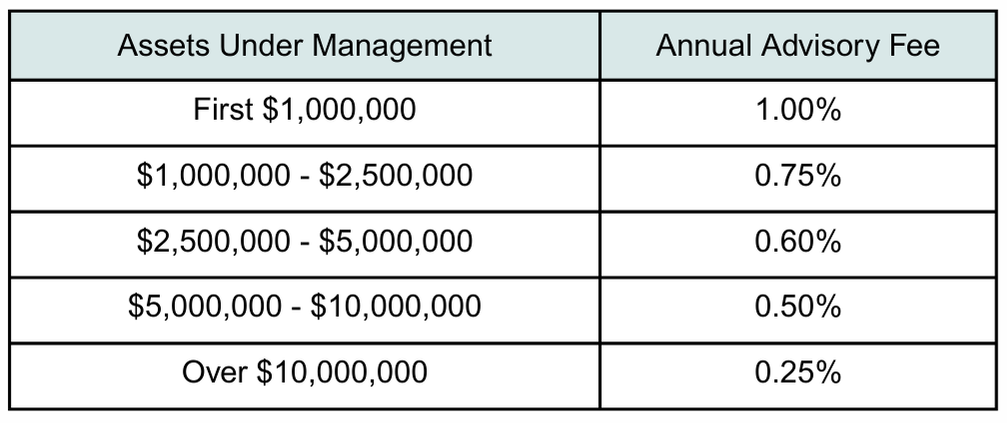 For clients with assets under management below $1,000,000, our minimum quarterly advisory fee is $2,500. Once assets reach $1,000,000, the fee schedule above then applies.